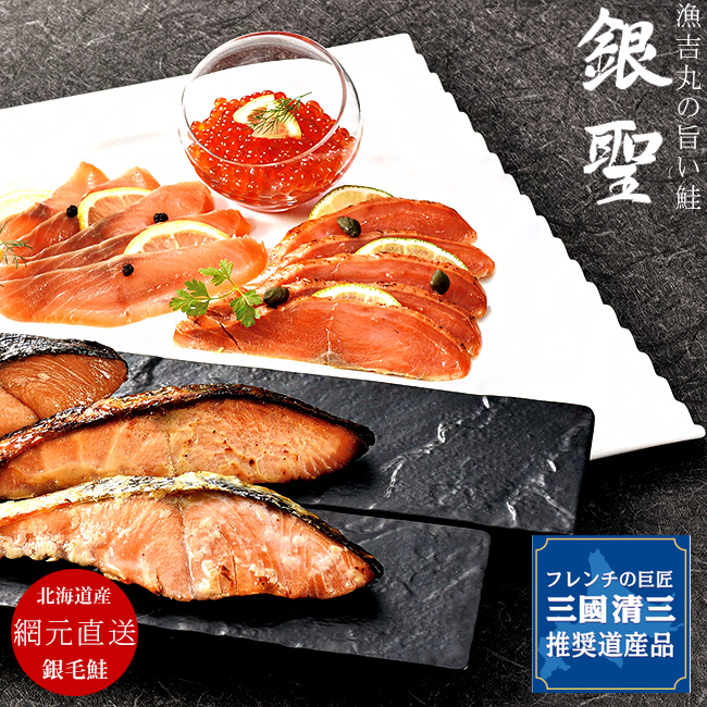 北海道日高のブランド鮭である『銀聖』の鮭切身とスモークサーモン、炙り焼のバラエティセット。それぞれ違った銀聖を味わえる詰合せです。![]() ![]() ■三國清三セレクション 自身の出身地である北海道を愛し、素材の「生まれ育ち」にこだわるフレンチの巨匠・三國清三が北海道内で生産・加工される食品の中から厳選した商品です。 北海道の優れた食材や食品を紹介させていただくと共に、技術監修や産地交流を通じて北海道の食にかかわる生産者の方々を応援する事を目的として作られました。 ![]() 北海道日高沖の豊かな海で漁獲されています。銀色に輝く魚体から、銀毛と呼ばれ、餌が豊富な海域で育つ事で、白身魚でありながら身の色は紅鮭にも劣らない鮮やかなサーモンピンクです。 また、定置網で漁獲される事で、生きたまま漁獲することができますので鮮度を保つ事が可能です。日高で水揚げされる鮭のうちの5〜6%程しかおらず、希少性の高い鮭です。味はもちろん、脂のりも素晴らしく「鮭より旨い鮭」と言われています。 定置網で漁獲する事で、傷をつけず新鮮なまま漁獲する事ができます。またこちらの銀聖は、水揚げして約2時間程で加工しますので、、かなり新鮮なまま処理されています。 銀聖は日高山脈を流れる清流を母として育って約3-5年程北太平洋を回遊します。そして栄養豊富なエサを食べ、天然の脂をしっかりと蓄えます。銀聖の脂は、養殖サケの様な滴り落ちる様な脂とは違い、上品でしっとりとした旨味があります。 鮭の切り身は、日本人の朝食のメイン食材といっても良い程、定番とされていたり、飲食店でも朝食メニューに加えられたりしています。しかし、鮭の切り身は朝食だけでなく、晩御飯でも食べられますし、おにぎりの具材としても活躍します。そんなありふれたオカズの1つでもある、鮭の切り身を『銀聖』で食べるというのは、いつもの日常からかけ離れた豪華なおかずになります。北海道を代表する鮭『銀聖』を使った、銀聖の焼漬し、銀聖塩麹焼き、銀聖の大豆味噌焼きと、その時の気分に合わせて食べる事が出来るセットになってます。 何故鮭をスモークサーモンにするのかと言うと、銀聖の様に脂乗りの良い魚はスモークにすると更に美味しくなるからなのです。燻製方法の一般的な方法としては、予め塩漬けにしてから、塩抜きと乾燥をおこない、20度前後の温度で時間をかけて燻製するのが一般的です。スモークサーモンはそのまま盛りつけるだけで、とてもおしゃれな一皿に変身します。サラダに入れても、オードブルにしても、アレンジいろいろです。また、チーズとも相性が良いので、おやつとしても、お酒の肴としても合う事間違いなしです。スモークサーモン1つあれば、ごちそうメニューが無数にひろがります。 スモークサーモンだけでなく炙りサーモンもセットになっています!解凍してすぐにお皿に開けて食べる事が出来ます。何もつけなくても美味しく召上ることが出来ますし、おかずだけでなく、お酒の肴にもぴったりです!また、パスタに入れたりすれば美味しい料理に変身します。アレンジで色々な料理に合いますので、是非試してみてください!! スモークサーモンと炙りサーモンはご飯ともよく合います。少し小さく切って、ご飯に乗せてお茶漬けにしても美味しいですし、海苔巻きにしても絶品です。下味がしっかりと付いていますから、お醤油をつけなくても食べれちゃいます!!また、銀聖の特徴でもある上品な脂がとても美味しく、軽く炙った炙りサーモンは、火を通すことにより香ばしさが出て美味しく食べる事が出来ます!! 北海道のブランド鮭『銀聖』の卵を一粒一粒ていねいにほぐしたいくら醤油漬です。北海道『銀聖』の鮭の卵の素材を最大限に引き出し、こだわりの醤油漬けはコク、香り、旨みでいくらの味を一層引き立てます。通常のいくら醤油漬では味わえない最高の味をお楽しみいただける逸品です。 鮭は産卵の為に産まれた川に戻ります。しかし真水に触れてしまうと鮭の身体は黒くなり、本来の銀色の身体を失います。川に戻る前の沖合で漁獲し、その中でも高品質な鮭を究極の鮭と賞賛し、『銀聖』と呼びます。 『銀聖』というブランドは日高定置漁業者組合が名称とキャラクターを募集し、多数の応募の中から『銀聖』という名前と銀色に輝く力強い鮭の姿をキャラクターとして選抜しました。この名前とキャラクターを含む認証ラベルは商標登録されており、このラベルが無いものは、日高沖で漁獲された鮭だとしても『銀聖』ではありません。1体ごとにしっかりと個体ナンバーが有り、取扱い管理を厳しくしています。 厳しい基準をクリアした日高沖で漁獲された鮭、『銀聖』。引締った身にも関わらずしっとり柔らかく、そしてスモークサーモンと炙り焼きもセットになった、銀聖づくしの至極の味わいです。![]()
