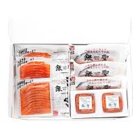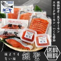 北海道日高のブランド鮭である『銀聖』の塩鮭切身・いくら醤油漬・炙りサーモン・スモークサーモンのバラエティセット。それぞれ違う銀聖を味わえる詰合せです。![]()