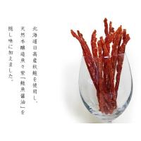 北海道産の鮭をじっくり丁寧に干しあげて乾燥させた『鮭ジャーキー』です。スティックタイプになっており、食べやすくて美味しい珍味です! 優良ふるさと食品中央コンクールの国産畜水産品利用部門で、最高賞の農林水産大臣賞を受賞した。北海道産の鮭と北海道産のチーズの絶妙なコラボレーションを楽しめる珍味です。『鮭ジャーキー』という言葉は余り聞き慣れない言葉です。鮭トバやビーフジャーキーといった保存食としての珍味は良く耳にしますが、サーモンでジャーキーとなると珍しく、まさに珍品です。 ジャーキー(JERKY)とは、元々アメリカの先住民が、保存食としてお肉を乾燥させたものです。 肉ではなく鮭を使って作るという発想が、北海道ならではです!! そして忘れてならないのが味付けです。北海道産の鮭を使用し、チーズと魚醤油が絶妙なアクセントの『鮭ジャーキー』に仕上がっています!