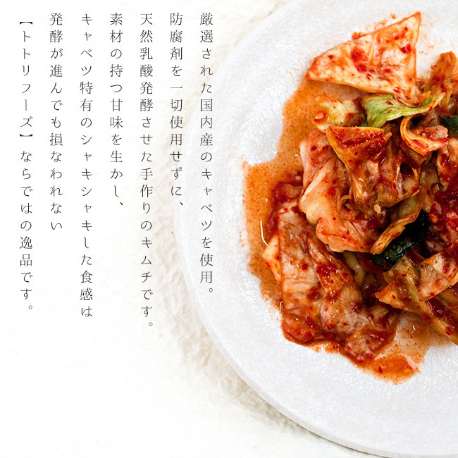 ■ 元祖キャベツキムチ ■ 元祖!キャベツキムチ【トトリフーズ】のオリジナルキムチの1つの、元祖キャベツキムチです。何と言ってもキャベツのシャキシャキ感が心地よくて、他のキムチでは味わう事の出来ない食感がキャベツキムチの特徴です。このシャキシャキした食感は発酵が進んでも損なわれることがありませんので、食べきるまでシャキシャキの食感を楽しむことが出来ます。元祖キャベツキムチは防腐剤を一切使用せずに天然発酵させた手作りの逸品で、素材の持つ甘味を生かしているので、甘さを感じる分、強い辛さが後から押し寄せるキムチです。 北海道を中心に厳選した素材選びと、韓国伝統の味を日本人好みに調理した【トトリフーズ】オリジナルのキムチです。調味液を使わずに、素材からでた甘味と水分が美味しい調和を作ってくれています。 ご飯のおともとしてはもちろん、お酒の肴として食べたり、キムチ鍋やキムチ炒飯、牛丼や納豆等様々な素材・料理に合わせる事が出来るのがキムチの良い所です。【トトリフーズ】のキムチは防腐剤を使用せず、乳酸発酵させているのも特徴で、全て手作りで作られています。 ※元々キムチは乳酸菌を含む為に、腸内環境を改善する働きがあるといわれておりますので、食べ過ぎには御気を付け下さい。 甘味と旨味、そして辛味が見事に調和して、酸味を抑えたキムチです。全て手作りなので、機械で製造されたキムチとはやはり違います。 辛さが際立つキムチですが、【トトリフーズ】のキムチは辛さだけでなく、野菜の甘味と旨味もしっかりと味わえる最高峰のキムチです。通常焼肉屋さんでしか味わえない【トトリフーズ】のキムチをどうぞ御賞味下さい!![]()