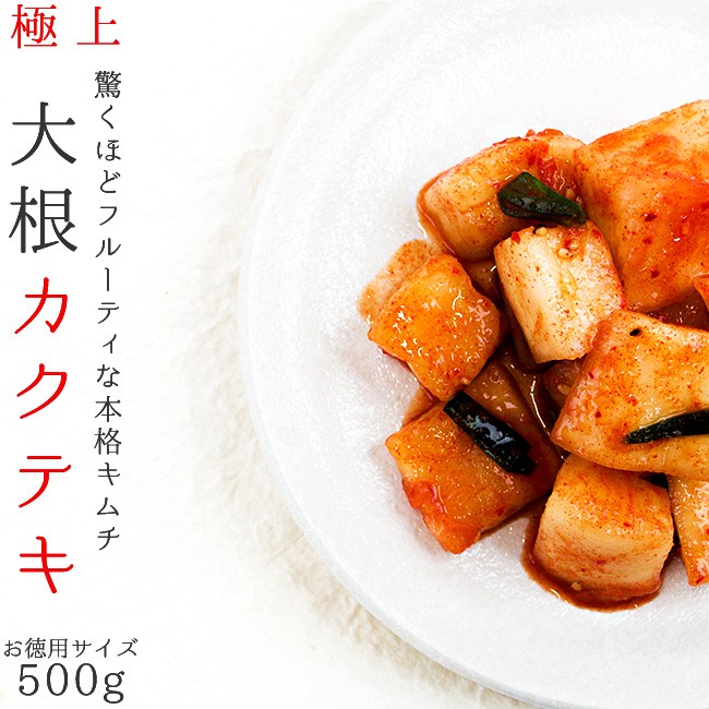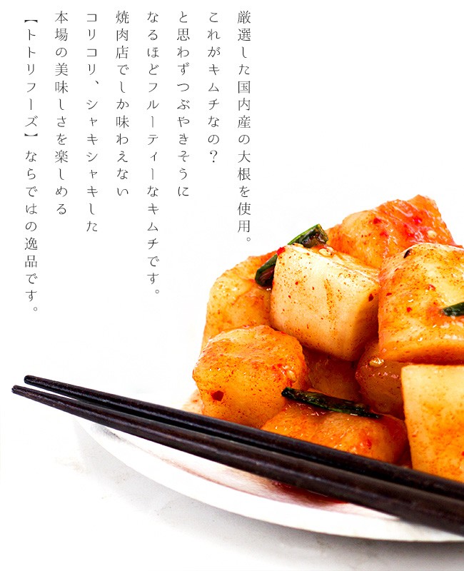 ■ 極上大根カクテキ ■ 極上!大根カクテキ【トトリフーズ】の評判が良くリピート率が高いキムチの1つの大根カクテキです。食べた瞬間「これが本当にキムチなの?」と思わずつぶやきそうになる程、辛さよりもフルーティさを味わう事が出来るキムチです。食感もよくシャキシャキとコリコリが味わえて、程よい辛さも相まってどんどん食べれてしまえる絶品カクテキです。防腐剤を一切使用せずに天然発酵させた手作りの逸品で、焼き肉店でしか味わえない本場の美味しさをお楽しみいただけます。 北海道を中心に厳選した素材選びと、韓国伝統の味を日本人好みに調理した【トトリフーズ】オリジナルのキムチです。調味液を使わずに、素材からでた甘味と水分が美味しい調和を作ってくれています。 ご飯のおともとしてはもちろん、お酒の肴として食べたり、キムチ鍋やキムチ炒飯、牛丼や納豆等様々な素材・料理に合わせる事が出来るのがキムチの良い所です。【トトリフーズ】のキムチは防腐剤を使用せず、乳酸発酵させているのも特徴で、全て手作りで作られています。 ※元々キムチは乳酸菌を含む為に、腸内環境を改善する働きがあるといわれておりますので、食べ過ぎには御気を付け下さい。 甘味と旨味、そして辛味が見事に調和して、酸味を抑えたキムチです。全て手作りなので、機械で製造されたキムチとはやはり違います。 辛さが際立つキムチですが、【トトリフーズ】のキムチは辛さだけでなく、野菜の甘味と旨味もしっかりと味わえる最高峰のキムチです。通常焼肉屋さんでしか味わえない【トトリフーズ】のキムチをどうぞ御賞味下さい!![]()