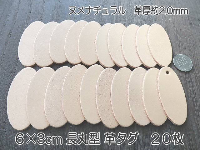 6cm長丸型20枚 本ヌメ革タグ 無地・ナチュラル オリジナル名札