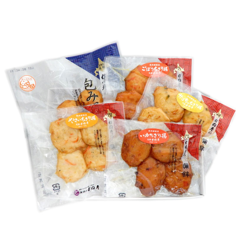 昔ながらの手作りな深い味わい。ひとくちサイズの定番おつまみタイプです。 上質のすりみで経験豊かな職人がひと手間ひと手間ていねいに「ちぎり揚げ」にしました。ごぼうちぎり揚げ4個入×1袋・いかちぎり揚げ4個入×1袋・やさいちぎり揚げ4個入×1袋・かぼちゃちぎり揚げ4個入×1袋・チーズ包み揚げ6個入×1袋の蒲鉾贈答セットです。