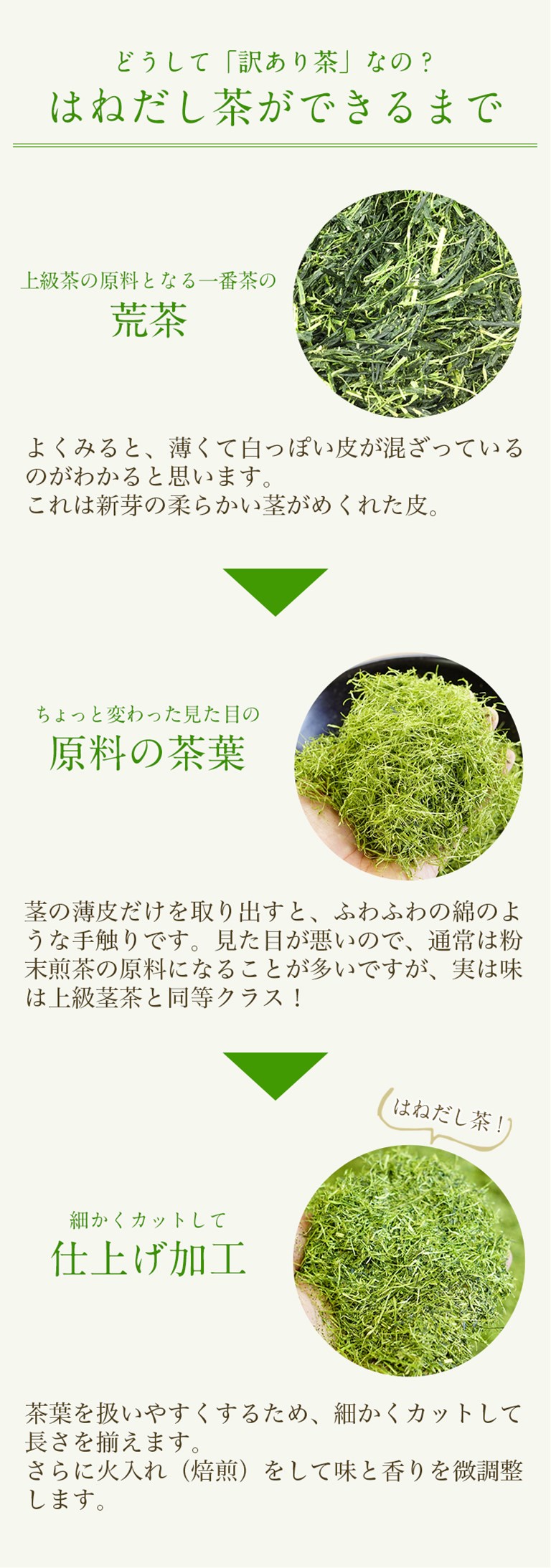 | 上級茶の仕上げ工程ではねだされた茎の皮を使ったお茶です。 製茶の際にとれた茎茶の皮から作った「わけありのお茶」 100グラム1,000円の棒茶と同じ原料ですので、もちろん味と香りは最高クラスです。 百貨店やスーパーではまず手に入らない製茶場ならではの商品です。 茎茶や粉茶と違って、量が取れないので市場にもあまり出回りません。 デメリットは、薄い皮の茶なので、二煎目以降は味が出ません。 また、煎茶になれた人にとっては、見た目がふわふわの皮なので少し見慣れないと思います。 ご家庭で夏場にシャカシャカ水出し、というのにはベストな茶葉です。 ※この商品はメール便での発送はできません。 厚さが2ミリを越えるためお受けできません。 ご了承下さい。 |