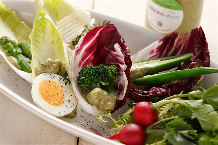 北海道のブロッコリーと隠し味にわさびを使ったバジル風味のディップ。
