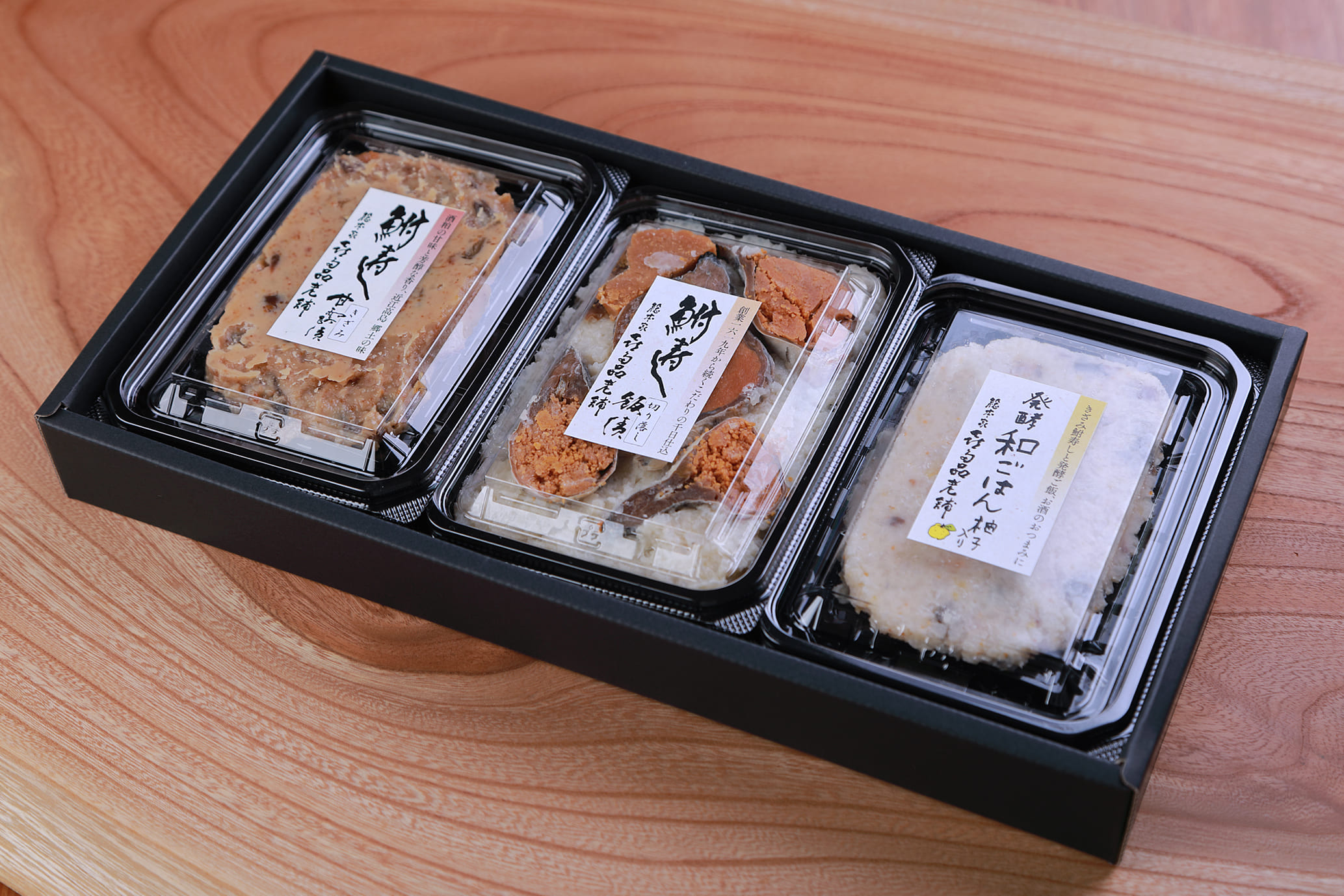 滋賀の伝統発酵食品「鮒寿し」3種を詰め合わせた人気の食べ比べセット。贈り物ギフトにもおすすめです。