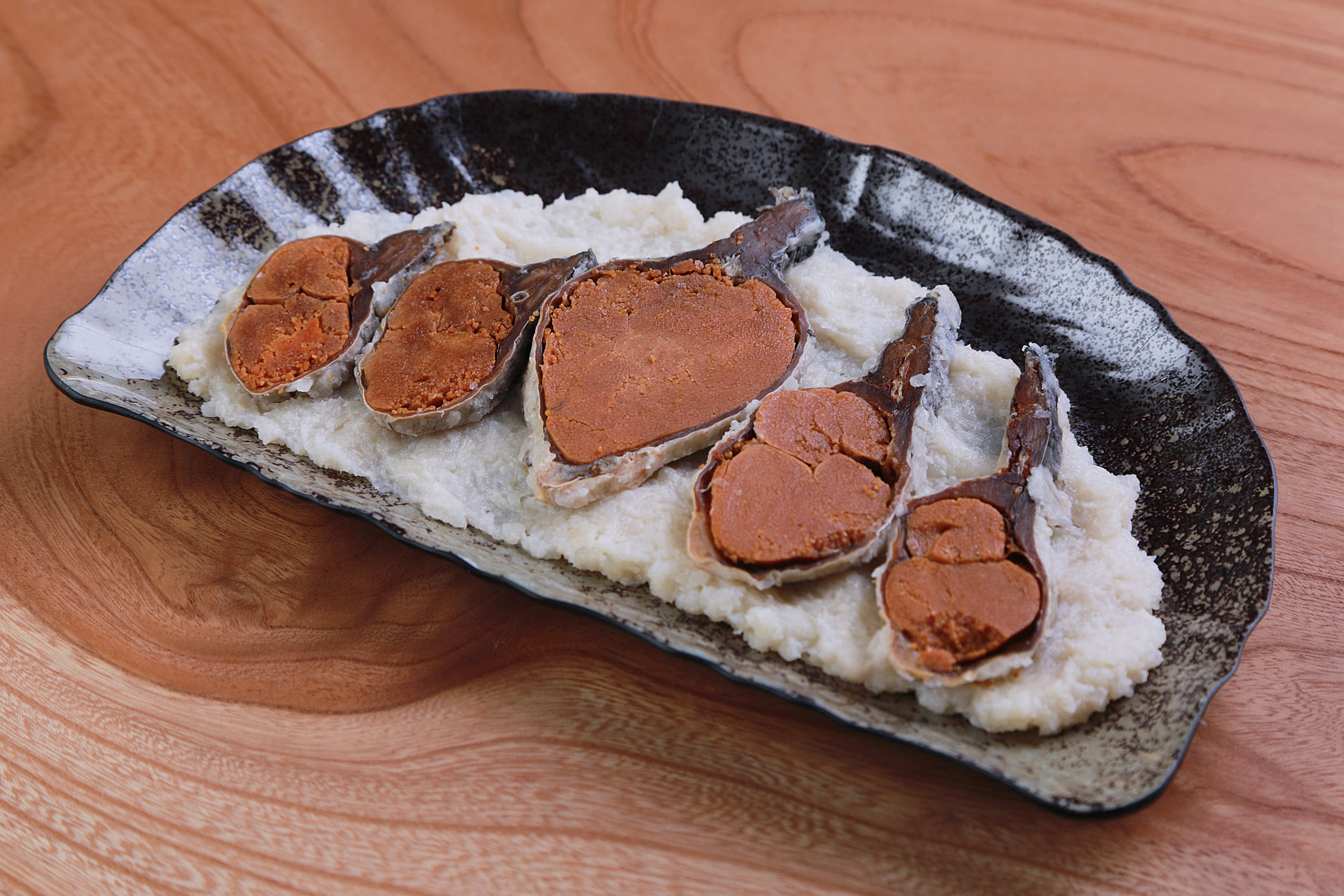 オレンジ色の卵がいっぱい詰まった鮒寿しは、酸味のあるふくよかな香気が食をそそり、和風チーズともいえる濃厚な味が口の中に広がります。