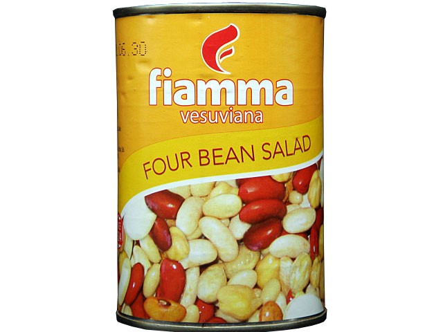 ライマメ、白いんげん豆、ガルバンゾー(ひよこ豆)、レッドキドニーの4種類の豆が入った水煮缶です。