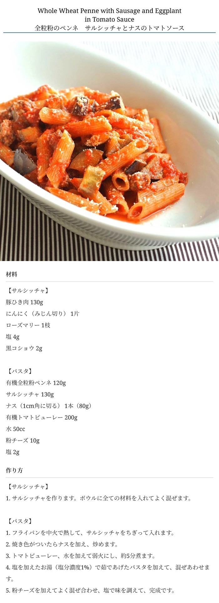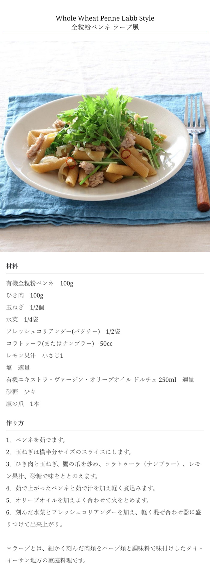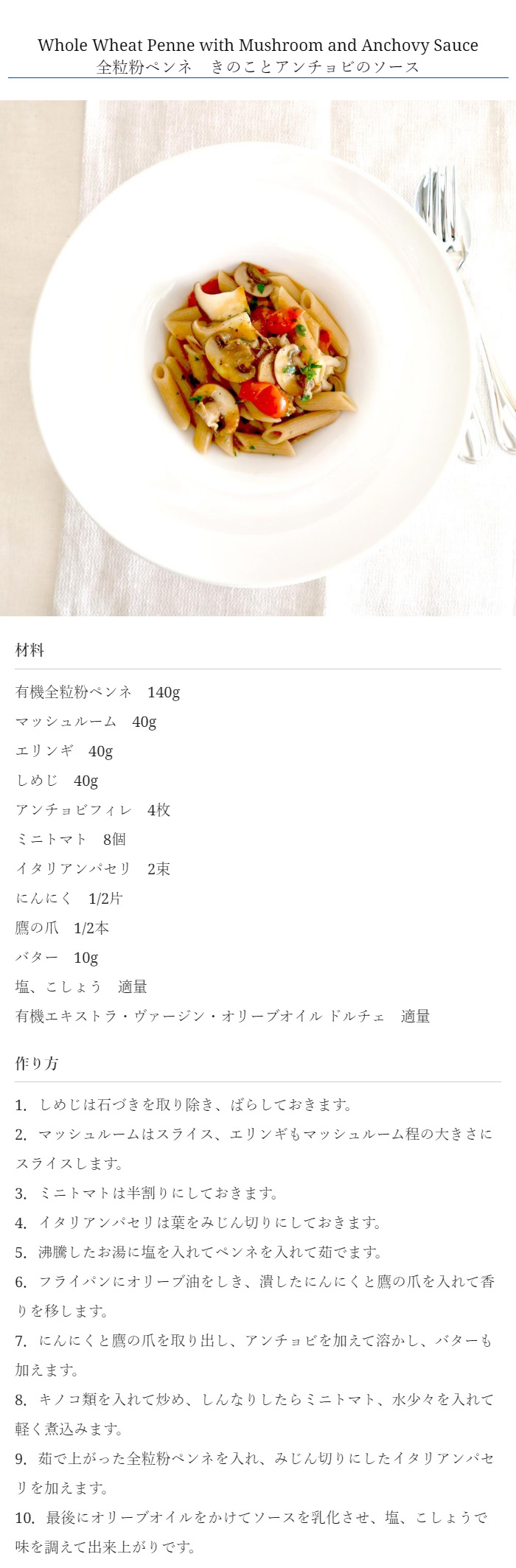 小麦を丸ごと挽いた全粒粉のペンネ。クリーミーなソースやジェノベーゼソースとも良く合います。繊維やミネラルも豊富です。ゆで時間9分。