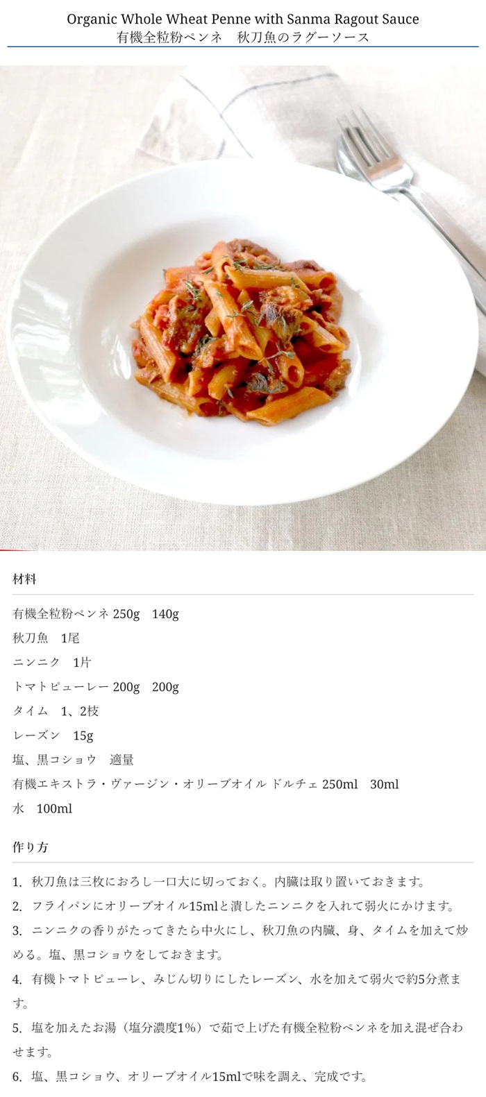 原材料名 有機デュラム小麦のセモリナ