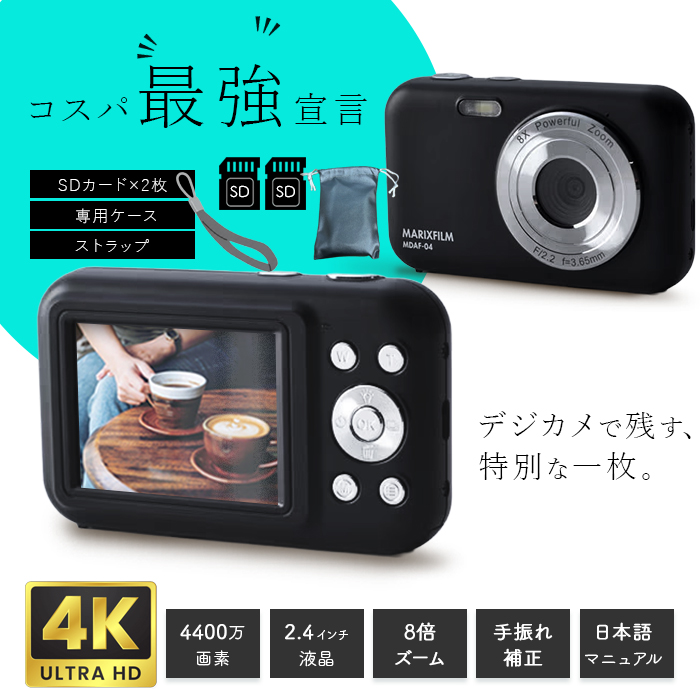 【SDカード2枚付】デジタルカメラ ストラップ付属 初心者 4K 8倍ズーム 日本語説明書 手ブレ補正 録画 オートフォーカス 小型 軽量 コンパクト デジカメ