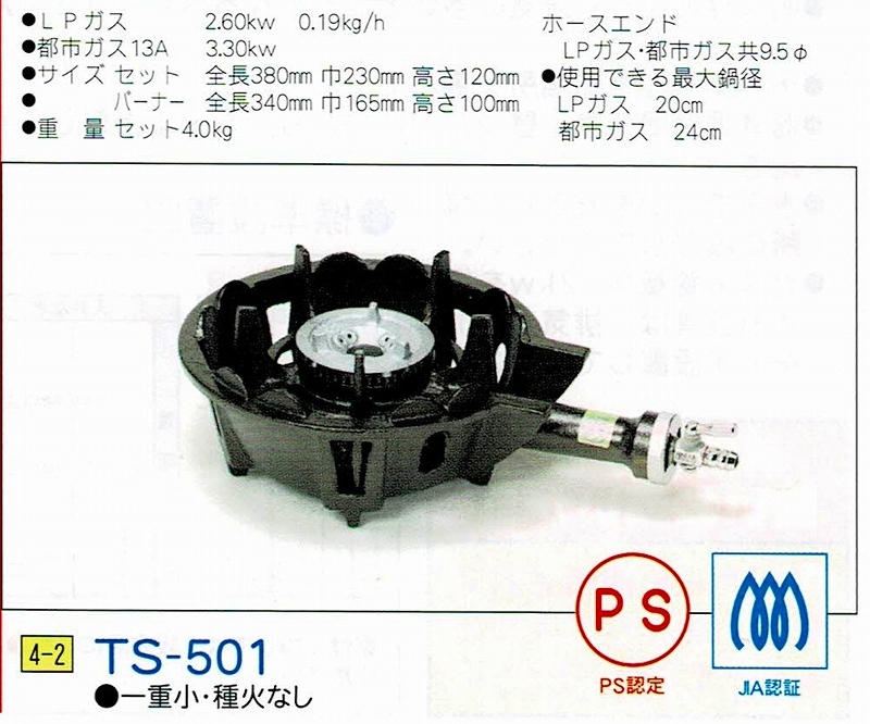 タチバナ ガスバーナー JIA認証 PS認定 鋳物コンロ TS-501(一重小、種火なし) LPガス・都市ガス12A.13A共用