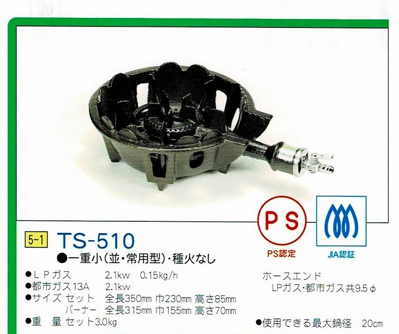 タチバナ ガスバーナー JIA認証 PS認定 鋳物コンロ TS-510(一重、種火なし) LPガス・都市ガス12A.13A共用