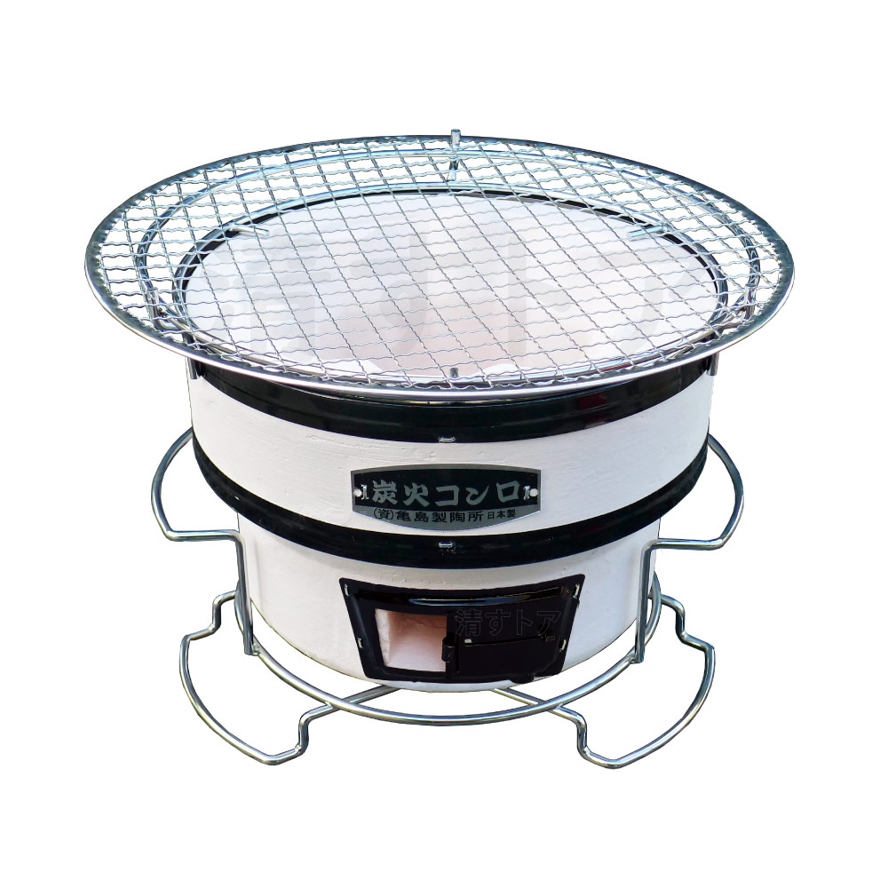 三河焼 しちりん じゅうじゅう 白 台、アミ止め付 珪藻土 三河粘土使用 七輪 コンロ 国産 業務用 KA0023