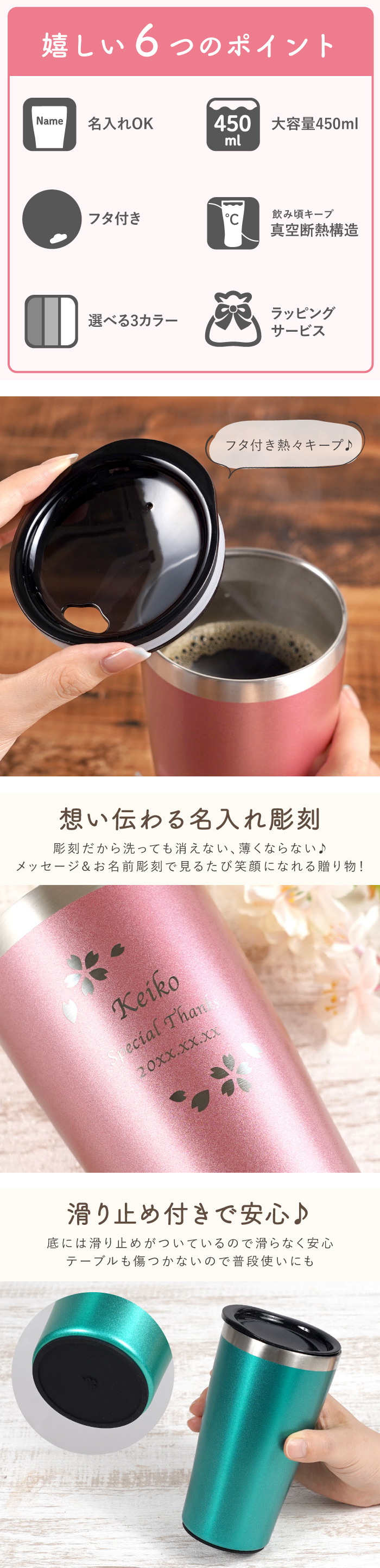 | 【 名入れOK!カラー真空断熱ステンレスタンブラー 】 ■名入れタンブラーで冷た〜いビールを。 お母さんのリラックスタイム♪ タップリ大容量の450ml★ 真空断熱二重構造だから冷たいものは冷たいまま、 温かいものは温かいまま 飲み頃温度を長時間保ちます。 結露しにくいのでコースター要らず。 ノンビリ読書のお供にも◎ 女性の手に嬉しいスリムタイプ。 毎日使うものだから使い心地にもカラーにもこだわりたい♪ いつまでも若々しく、綺麗でいて欲しいから華やかなデザインで★ | |