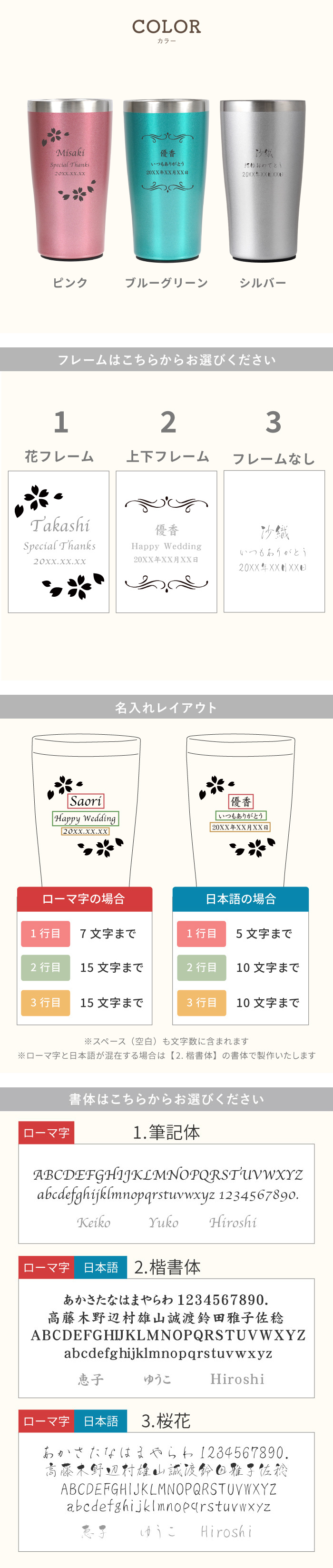 | 彫刻内容 | ■文字数 ●1行目:ローマ字7文字まで/日本語5文字まで ●2、3行目:ローマ字15文字まで/日本語10文字まで ※ローマ字と日本語が混在する場合は楷書体で製作致します ※旧字体には対応しておりませんので予めご了承ください |