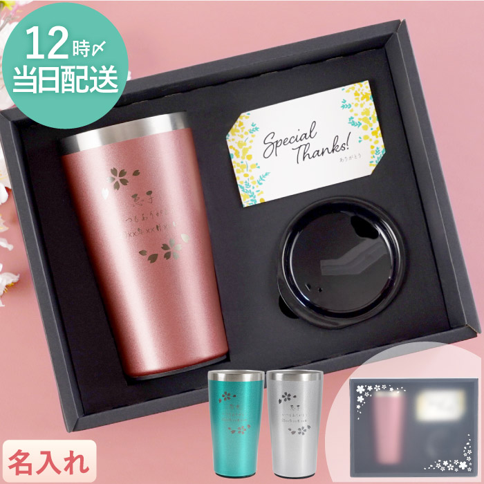 | ★送料無料★【カラー真空断熱ステンレスタンブラー 日本語Ver.】 ■お気に入りのお名前入りマイタンブラーで♪ビールもコーヒーも美味しい! ご要望にお応えしまして、日本語彫刻が登場! 真空断熱二重構造!冷たいものは冷たいまま、 温かいものは温かいままで、飲み頃温度を長時間保ってくれます。 結露しにくいので、 デスクでアイスコーヒーを嗜むのも◎ 大容量の450mlも嬉しい! 女性の手に嬉しいスリムタイプ。 毎日使うものだから使い心地にもカラーにもこだわりたい♪ いつまでも若々しく、綺麗でいて欲しいから華やかなデザインで 女性が喜ぶ、人気の桜柄。 お花見などのアウトドアにも使えるので 春は桜を見ながら、これでビールも最高! カラーは華やかなピンク、爽やかなブルーグリーン、選びやすいシルバーの3色から♪ 華やかカラーが印象的な 名入れ ステンレス タンブラーは、 おしゃれな彼女、女性、友人、お母さん、同僚へのギフトや 母の日、送別祝い、誕生祝い、の贈り物にもオススメ! 名前を入れて世界に一つのプレゼント! | |