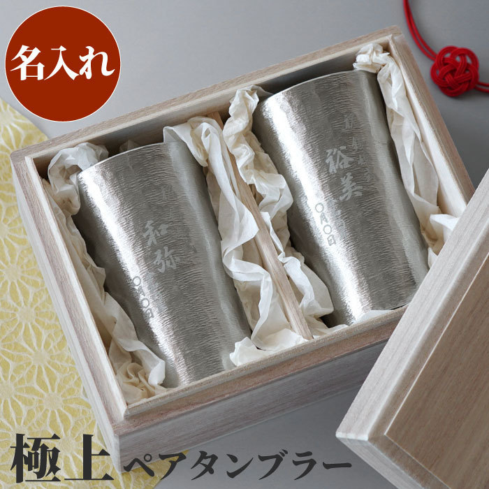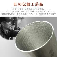 | 【名入れ 錫製タンブラー 200ml ペア】 極上のまろやか泡、錫製ペアタンブラー ■名入れで特別 名前を刻んで世界にひとつの特別なタンブラーに 結婚10周年を祝う錫婚式の贈り物にもおすすめです ■錫器で一層美味しく 錫は熱伝導率が良いため、ビールや冷酒をそそぐとすぐに冷えます また燗付きが早く、熱燗の芳醇さをより楽しめます ■錫器の効果 浄化作用、イオン効果により、雑味のないまろやかな風味になるといわれています。また、保温性も優れています ■匠の伝統工芸品 鋳型に鋳込みロクロで挽く、昔ながらの製法でひとつひとつ丹念に作られています。内側の凹凸がビールの細かいクリーミーな泡立ちを作ります 飽きの来ないデザイン、シルキー加工の錫ペアタンブラーは、錫婚式などのお祝いの贈り物や、記念日、父の日、母の日、敬老の日のギフトにおすすめです♪ | |