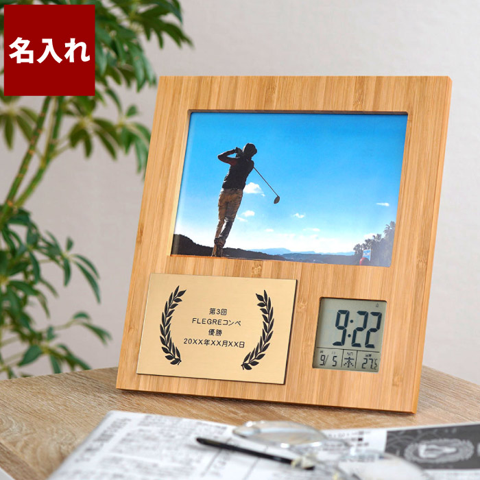 | 【名入れOK!(記章)竹の節目フォトフレーム】 ■天然素材の竹を使用 カレンダーと温度計の機能を搭載した、 時計付きで見た目も おしゃれ で使い勝手も大満足のフォトフレームです♪ お名前や日付を最大4行まで彫刻することができるから 記念品にぴったり! ■名入れで、オリジナルの特別なプレゼントに。 会社、学校、団体、クラブ、部活、社会人チームなどの コンペ、大会、競技会、社内表彰、他様々な表彰、記念の品として ゴルフが好きなお父さん、ゴルフ仲間、上司の方に洒落の効いた 誕生日プレゼント、父の日、昇進祝い、退職祝い、栄転、内祝いの贈り物としても♪ 名前を入れて世界に一つのプレゼント! | |