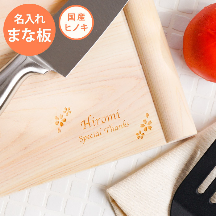 【国産ヒノキ使用 両面浮かせまな板】 いつもありがとう!の気持ちを込めて、毎日使うまな板に名前を彫刻して世界にひとつの贈り物 桜、薔薇、梅のフレームに彩られた名前とメッセージや記念日で料理の合間にもほっこり♪ 国産ヒノキの美しい光沢と、香りでリラックス♪主婦のアイデアから生まれたまな板です 側面の丸い加工のおかげで板面が調理台に直接つかないので衛生的かつ、自立するので乾燥が早く収納にも便利! お手入れも安心の取り扱い説明書付き リボン付きラッピングで最短、翌営発送なのでお急ぎのプレゼントにもおすすめです お母さん、義母、娘、奥様、お嫁さんへのお誕生日プレゼント、 お洒落なお友達への結婚祝い、結婚記念日、新築祝い、引越し祝い、新居祝い、 レストランやカフェの開店祝いのプレゼントにも♪ 名前を入れて世界に一つのプレゼント! | |