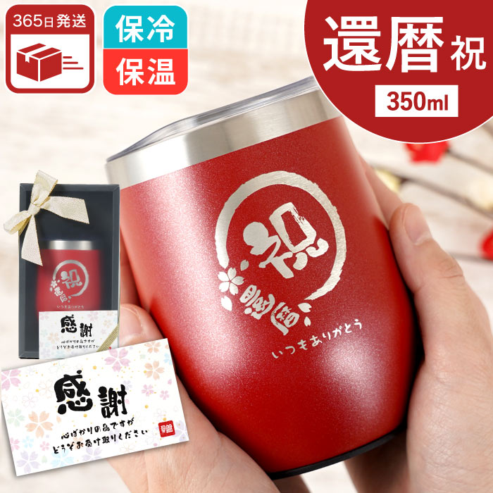 | 【 八福 タンブラー 真空 断熱 350ml 祝還暦 (赤) 】 当店限定!8つの福が詰まったタンブラーギフトセット。 ■還暦のお祝いにぴったりなメッセージ彫刻入り ステンレス製で落としても割れない。 真空二重構造によりホットもアイスも飲み頃温度をキープ。 また冷たい飲み物を入れても結露しにくく、温かい飲み物を入れても外側が熱くなりにくい。 温度キープ力を更に高めるフタと、底面には滑り止め付き。 ■メッセージ彫刻入りタンブラー 祝還暦のメッセージ彫刻入りタンブラーに加え、感謝のメッセージカードを入れ、送料無料でお届け。 ■急なギフトもおまかせ下さい 物流拠点より365日毎日発送! 最短で翌日のお届けが可能です♪ | |
