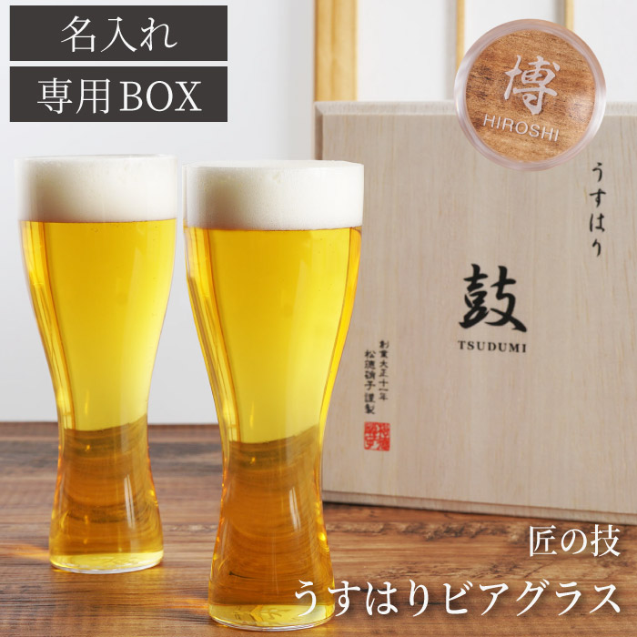 | 【うすはりビールグラス 木箱 2個入 】 飲み物をより美味しく、そして美しく楽しむ事のできる松徳硝子「うすはり」 うすはりとは?「うすはり」の「はり(玻璃)」とは、ガラスを意味します 名前の通り、薄いガラスで作られたこのグラスは、大正11年創業の松徳硝子が生み出した逸品 電球用のガラスを作っていた技術が通常の半分以下、0.9mmという極限の薄さを実現しました うすはりグラスは、全て職人の手によって一つ一つ丹精込めて作られており、特に底の薄さは世界で唯一、 松徳硝子の職人にしか吹けないと言われています この繊細な飲み口が、味を引き出し、氷の音、手にした感触に独特の味わいを出します 飲み物の本来の口当たりや香りを最大限に愉しみつつ、名入れの特別感を感じてください | |