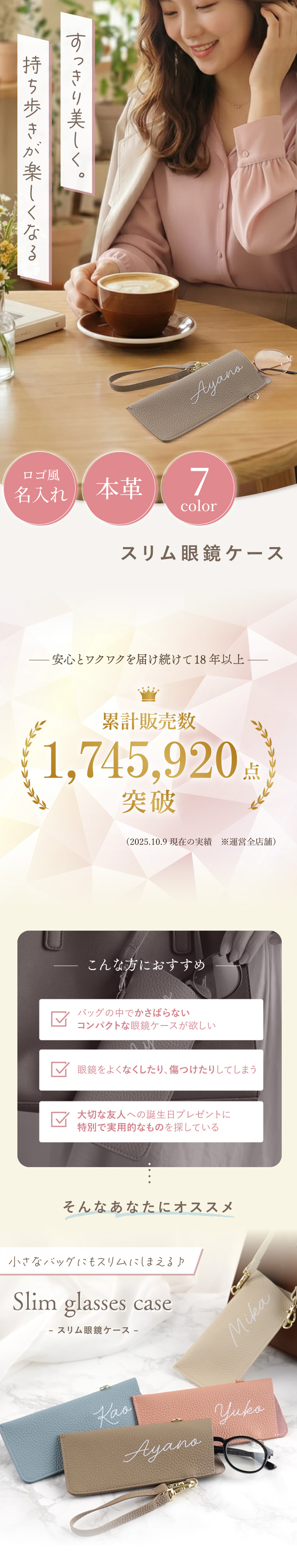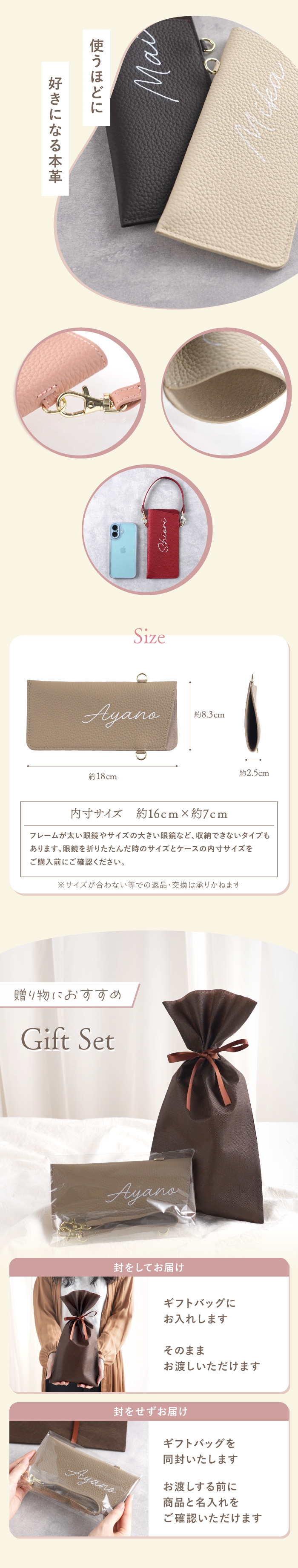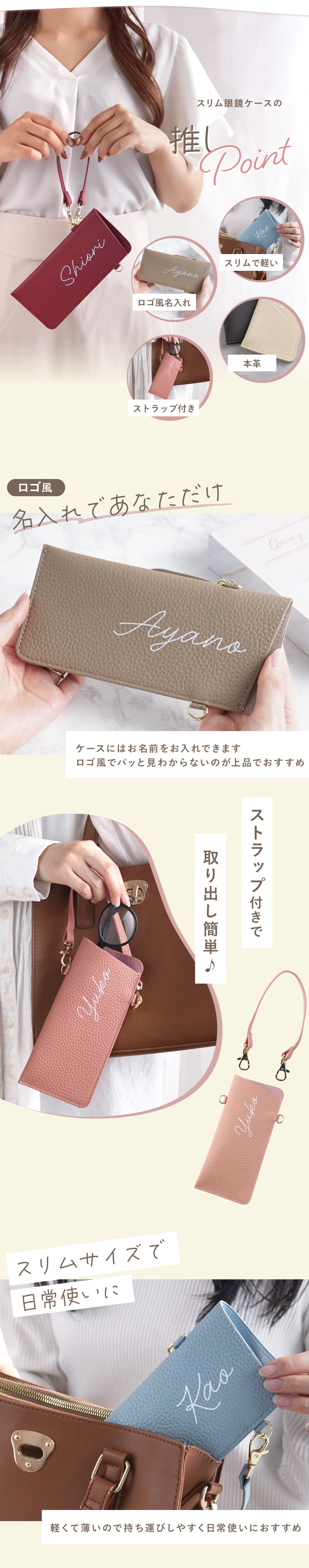 | 【本革 ストラップ付きスリム眼鏡ケース】 小さなバッグにもスリムにしまえる♪ 軽くて薄い、オトナ女子のための眼鏡ケースが新登場! ケースの両側についたDカンストラップは当店オリジナル仕様! 重心が偏らないから眼鏡が飛び出にくく安心して持ち運べます♪ ■取り外し可能なストラップ付 いつもバッグの中で迷子になりがちな眼鏡も、 バッグの持ち手に付ければ使いたい時にさっと取り出せます。 取り外しも可能なので、使わない時は外せばよりスリムに♪ ■選べる7カラー オトナ女子にぴったりなかわいいカラー揃えました! 好みのカラー、バッグに合わせて♪ ■ロゴみたいなおしゃれ名入れ ケースの中央にはお名前やメッセージをプリント可能! まるでロゴみたいな、おしゃれでインパクトのある名入れでプレゼントにぴったりです! 本革 ストラップ付きスリム眼鏡ケース は 20代 30代 40代 50代 60代 女性 への プレゼント に おすすめ です! 女友達 彼女 妻 お母さん へ 就職 転職 昇進 昇格 退職 送別会 の 贈り物 に♪ 母の日 に 母親 義母 妻 への プレゼント に◎ また クリスマス ホワイトデー バレンタインデーのお返し として 彼女 妻 への サプライズプレゼント にも 最適 です! 名前を入れて世界に一つのプレゼントに! | |