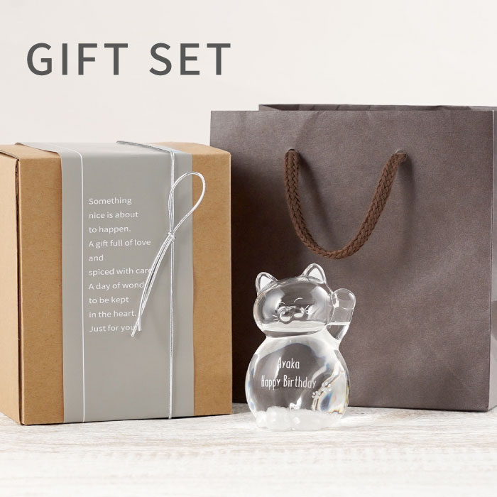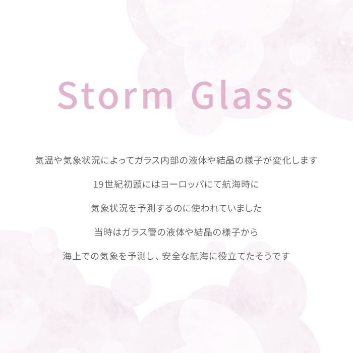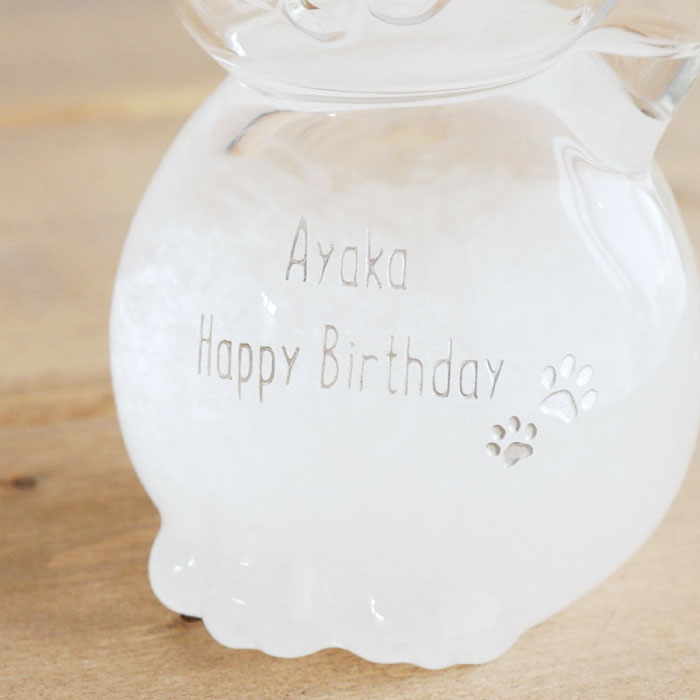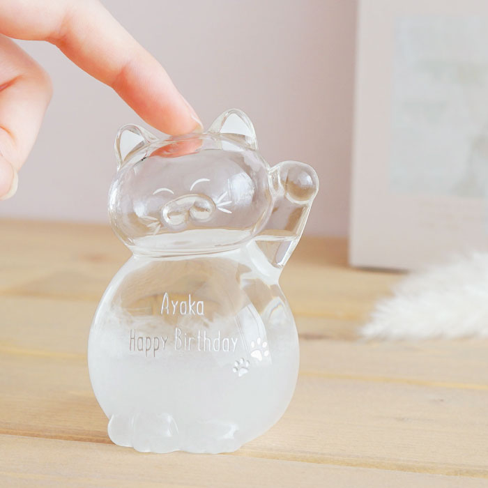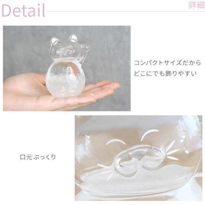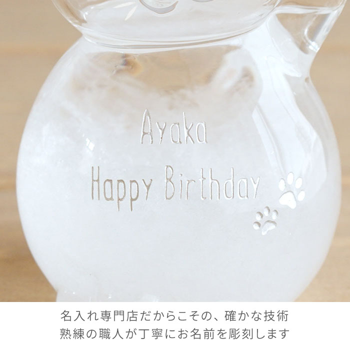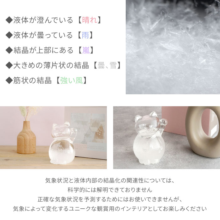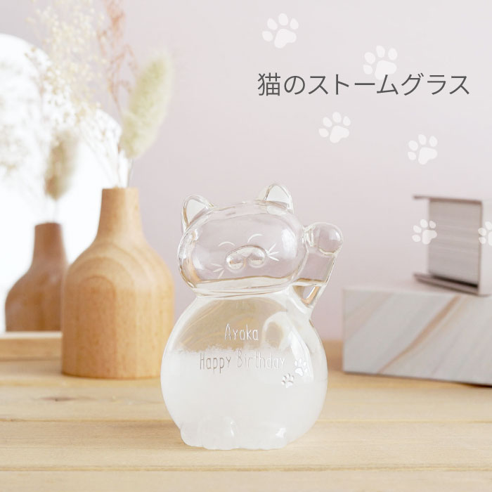 | 【猫のストームグラス 】 ストームグラス・ガラスフロート温度計をはじめとした Fun science(ファン・サイエンス) を展開するメーカー茶谷産業さんと当店のコラボ商品です! 商品の企画から携わり、ぷっくりした口元やくねっとしたシッポなど細部にまでこだわった猫型のストームグラスです。 「猫が顔を洗うと雨が降る」という古くからの言い伝えがあるように猫とお天気には深い関係があります そんな猫ちゃんをモチーフにした気温や気象状況によって液体内の結晶が変化する様を楽しめるインテリアです♪ 手のひらサイズのちょこんと丸いフォルムが可愛い! 左手を上げている招き猫のように商売繁盛や良縁など人に関する福を呼び込んでくれるかも…!? 小柄なサイズなのでデスクや玄関などお好きなところに飾れ、見ているだけで癒されます シルバーの名入れでさりげない特別感をプラス+ ■ストームグラスとは 19世紀初頭、ヨーロッパにて航海時に気象状況を予測するのに使われていました 実際には気象状況と液体内部の結晶化の関連性については、科学的には解明できておりません 気象環境によって液体と結晶がユニークに変化しますので、観賞用のオーナメントとしてお楽しみください | |
