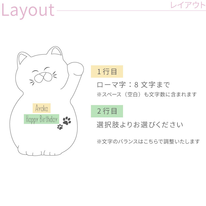 | 彫刻内容 | 1行目:【ローマ字8文字まで】 2行目:【選択肢よりお選びください】 ※スペース(空白)も文字数に含まれます |
