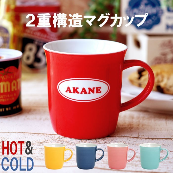 【 名入れOK! 二重構造 マグカップ 】 ■シンプルなワンカラーで使いやすい♪ とっても機能的な二重構造のマグカップ! 【二重構造】 温かいものも冷たいものもおいしい温度をほどよくキープ! 陶器で二重構造になっているので、 熱い飲み物を入れても外側がほんのり温かくなるだけで持ちやすく、 結露もしにくいのでコースターいらず♪ 電子レンジ・食洗機も使用可能! ■名入れで、オリジナルの特別なプレゼントに。 二重構造 マグカップは、 お友達、彼女、奥様、お母さん、女性への誕生日プレゼントに♪ 記念日、結婚祝い、結婚記念日のプレゼントとしてペアで贈っても◎ 新築祝い、引越し祝い、クリスマスのギフトにも! 世界にひとつのプレゼント! | |