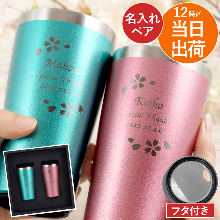 | 【 名入れOK! カラー真空断熱ステンレスタンブラー 450ml 桜 ペア 】 ■結婚祝いや結婚記念日に割れないペアギフト。 ビール好きのふたりへ!お名前入りの名入れタンブラーのペアセットです。 キュートなカラーのスリムタイプだから女性にも使いやすい♪ 450mlのタップリ大容量でビールが美味しい! 真空断熱二重構造だから、冷たいものは冷たいまま、温かいものは温かいまま飲み頃温度を長時間保ちます。 結露しにくいので、デスクでアイスコーヒーにも。 大切な人に贈るものだから… 職人がひとつひとつ丁寧に名入れ刻印いたします。 彫刻だから、洗っても消えません★ ひらりと舞う桜のデザインは当店のオリジナル! 大人のための甘すぎないデザインで使いやすい♪ ■名入れで、オリジナルの特別なプレゼントに。 真空断熱ステンレスタンブラー ペアは結婚記念日の贈り物に◎ ありがとうの気持ちを込めて、お父さんやお母さんへ 父の日 母の日 、還暦祝い 古希祝い など お友達への結婚祝いや新築祝い など 様々な贈り物やお礼お祝いに♪ 名入れで世界にひとつのプレゼント! | |