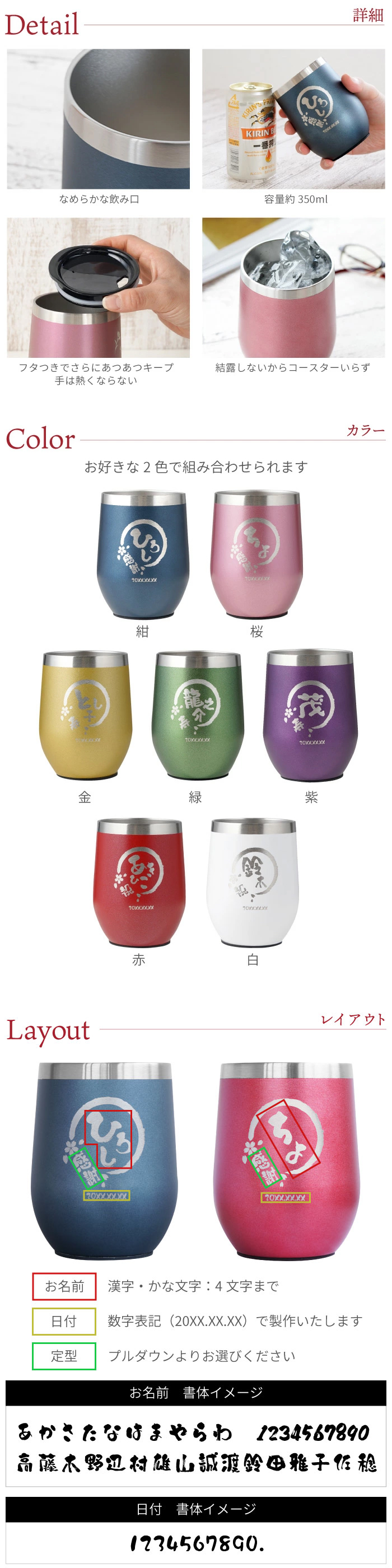 | 彫刻内容 | ■文字数 【お名前】 漢字・かな文字:4文字まで 【定型】 それぞれプルダウンよりお選びください 【日付】 数字表記(20XX.XX.XX)で製作いたします |