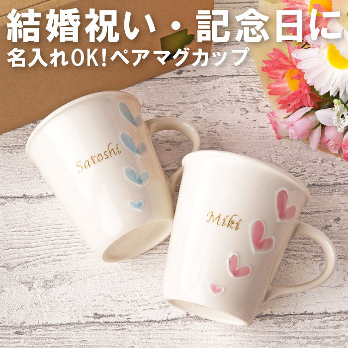 【 名入れOK! スイートハートペアマグカップ 】 ■結婚祝いや記念日のお祝いギフトに 可愛い手書きのハートが入ったピンクとブルーの ペアマグカップ♪ ゴールドの名入れで豪華に演出! 大切な友達の結婚祝いにピッタリです。 陶磁器なので電子レンジOK! 可愛くて実用的な喜ばれる贈り物♪ ■オリジナルで特別なギフト、プレゼントに! オーバル型ハートペアマグカップは、 お友達への結婚祝いや誕生日、引越祝いのギフトにぴったり! 夫婦の結婚記念日や陶婚式の贈り物にも! クリスマスや、バレンタイン、ホワイトーデーの お返しにも嬉しい♪ 名入れで世界に一つのプレゼント! | |