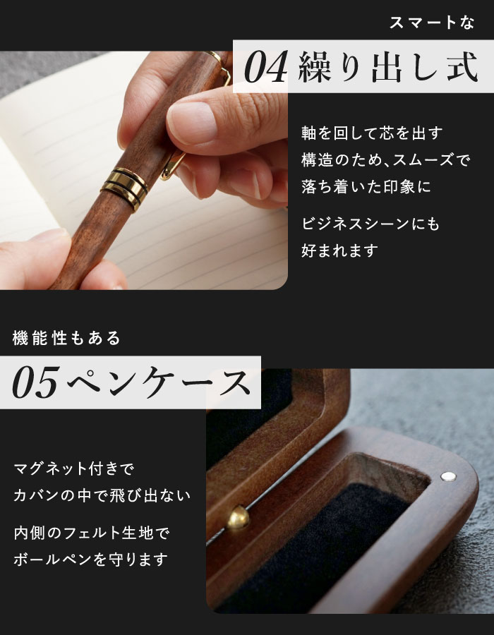 | 仕様 / サイズ | ■材質:天然木、スチール ■サイズ:(ボールペン)145mm×φ15mm/ (ペンケース)175mm×40mm ■芯:黒1.0mm(中字) ■重量:(ボールペン)約20g/(ペンケース)約70g ■包装:布貼り特製ギフトBOX入り ※当商品は天然素材を使用しているため、 ひとつひとつ木目や色合いが異なります。予めご了承ください。 |