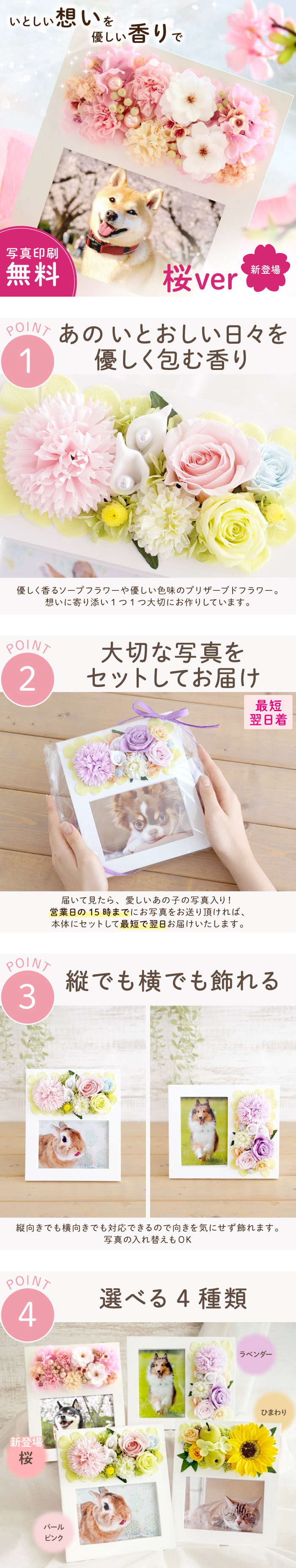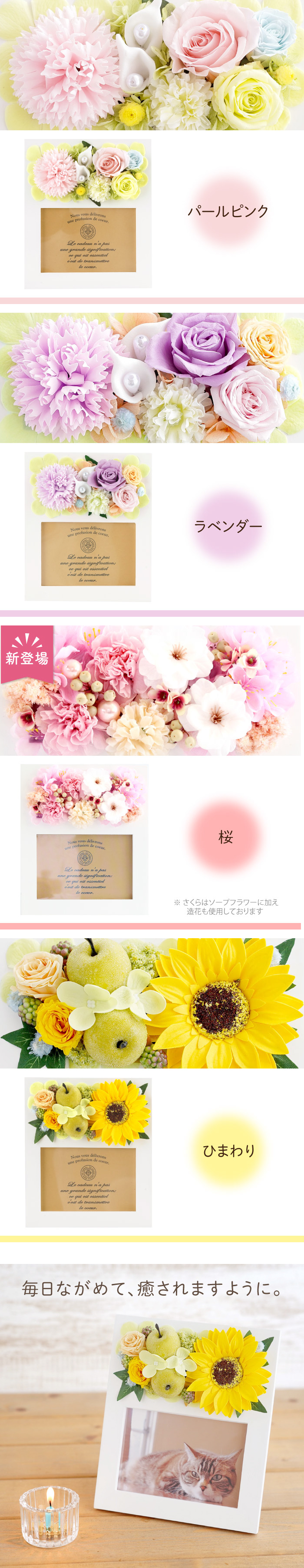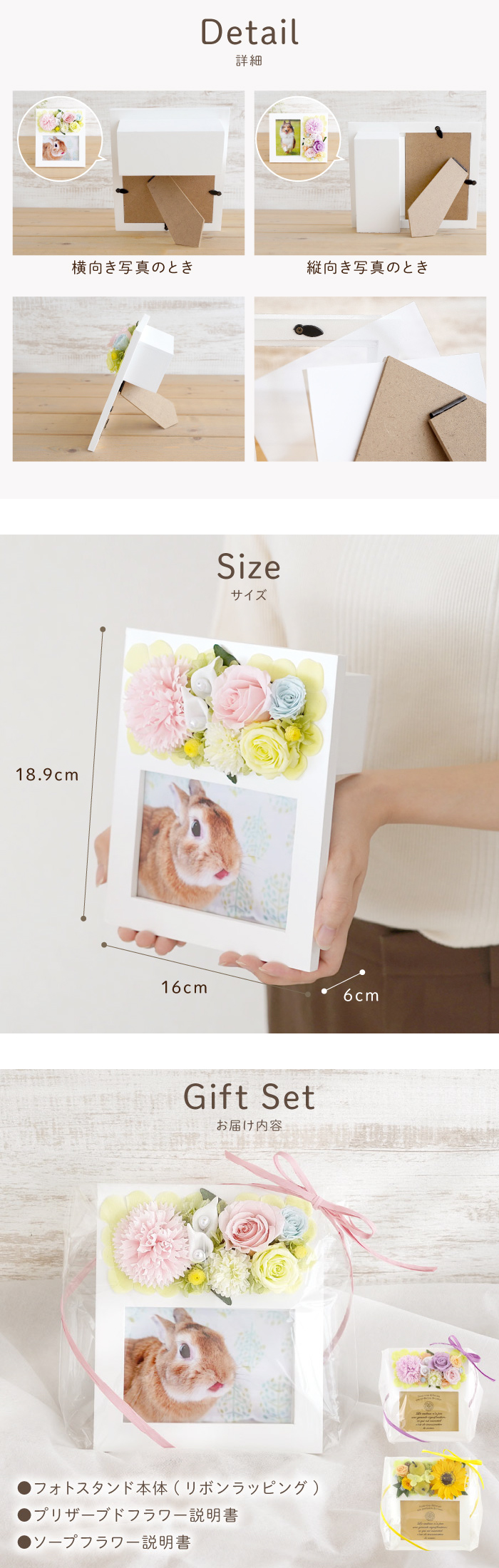 | 仕様 / サイズ | ■種類:プリザーブドフラワー ※ひとつひとつ大切に手作りしております※ 天然素材のプリザーブドフラワーを使用しているため 写真とまったく同じ形・配置にはなりません。 その点、ご了承の上ご購入くださいませ。 ※お花の痛みや色あせを早めますので、湿気・直射日光を避けてお飾りくださいませ。 【使用素材】 ■プリザーブドフラワー(バラ、あじさい)、ソープフラワー(カーネーション、ひまわり、あじさい)、アーティフィシャルフラワー(ピンポンマム) ■フォトフレーム:木製 ■サイズ:縦18.9cm×横16cm×奥行6cm ■対応写真サイズ:L版 ■セット内容 :フォトスタンド本体、プリザーブドフラワー、ソープフラワーの取り扱い説明書 ■ギフト仕様 :全てラッピングをしてお届けいたします ■メッセージカードをご希望の方はメッセージを「備考欄」にご記載くださいませ ※【写真プリントサービス】を希望する方はこちらを必ずご確認ください ■写真データの送り方写真のjpgデータをメールに添付してください 『info@hanamarika.com』※クリックするとメールアプリが開きます へ送信 (メール本文に購入者様のお名前を記載ください) ※ソーシャルギフトご注意点※ 写真プリントサービスは対象外とさせていただきます |