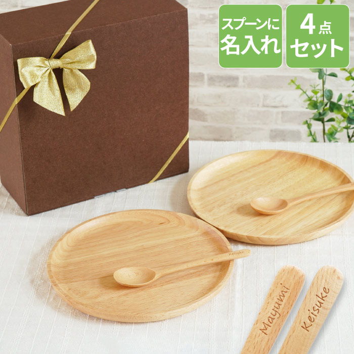 | 【木製食器 4点セット】 木の温もりが伝わる、木製食器4点セット スプーンにふたりのお名前を彫刻して、使うたび嬉しい贈り物に レーザーで彫刻するから洗っても消えず、薄くもなりません シンプルなデザインのプレートはどんな料理にも相性抜群 専用のボックスにお入れし、リボンをつけてお届けいたします 名入れなのに最短、翌営業日発送なのでお急ぎのプレゼントにもおすすめです! お揃いの木製食器で、あたたかな食卓を | |