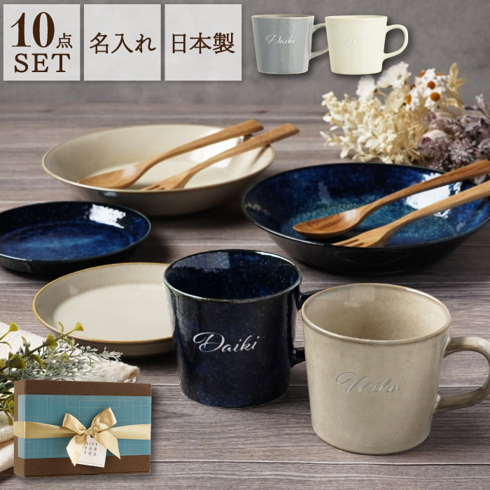 | 【美濃焼 幸せ運ぶ食器セット】 結婚祝いに贈りたい、幸せを運ぶプレミアムな食器セット。 ◆毎日使いたい、愛着がわく北欧風カラーの器たち お部屋の雰囲気を問わずインテリアに馴染むシンプルなデザインながら、一つ一つに個性が溢れる釉薬の揺らぎがアクセントに。 単色でありながら、濃淡、繊細な粒子、うっすらと浮かぶ白濁など、全く同じ表情はありません。 手作業によって作られているため、商品ごとに異なる色や風合いは個性としてお楽しみください。 料理を選ばず、日常使いしやすい21cmと14cmのプレート。 大きいプレートは目玉焼きやパスタ、カレーなど、メインのお料理にぴったりです。 小さいプレートはサラダやケーキ、取り皿など、マルチに使いやすいサイズです。 マグカップは320mlと大きめサイズ。 暖かい飲み物だけでなく、口縁も広いため洗いやすく、大きな氷も入るので冷たい飲み物にも便利です。 プレート、マグカップ共に電子レンジ・食洗機使用可能なため、毎日気兼ねなくお使いいただけます。 ◆日本の誇る伝統工芸、美濃焼 美濃焼とは、岐阜県南部の東濃地方で作られている陶磁器の総称です。 美濃焼は特徴を持たないことが特徴であり、多様なデザインがあります。 そのため、現代の食卓にも合う製品が多く、丈夫であるため、日常使いしやすいクセのない器です。 ◆持ちやすくおしゃれ見えする、天然木のカトラリー 天然の栗の木を使用した、ナチュラルな食器セットにぴったりのスプーンとフォーク。 持ち手の部分は山形にカットされており、おしゃれでモダンな印象を与えてくれます。 少し厚みを残しているため持ちやすく、しっかり掬って刺せる実用性も◎ さらに特殊なコーティングが施されているため、食洗機使用可能。メンテナンスも楽々です。 ◆食卓を笑顔に、ずっと消えない名入れ彫刻 マグカップにはお二人の名前を彫刻できます。 お二人の新しい門出を祝うにぴったりのプレゼントになること間違いなし。 彫刻だから洗っても消えない、薄くならない。 永遠に続く二人の幸せを祈る想いを、お名前と一緒に刻みます。 | |