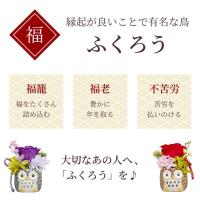 | 【 名入れ ふくろうプリザ 】 ふくろうの器にプリザーブドフラワーが目を引く 敬老の日にぴったりな贈り物♪ ふくろうの間にはお名前とメッセージを入れられる立札をお付けします 世界にひとつの立札でみるたび笑顔に! クリアケースに入っているからホコリがつかず、 お手入れ不要でそのまま飾れます ふくろうの器に入っているお花は プリザーブドフラワーだから水やり不要で 枯れずにずっと綺麗♪ 大きすぎず飾りやすいサイズだから いつもそばに置いておけます♪ ■ふくろう 縁起が良いことで有名な鳥です ふくろうには様々な当て字があります ・福籠:福をたくさん詰め込む ・福老:豊かに年をとる ・不苦労:苦労を払いのける 大切な人に「ふくろう」の意味を込めて♪ 名入れで世界にひとつのプレゼント! 名入れ(立札)ナシverはこちら>> | |
