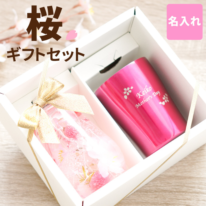 | 【 名入れ 桜ハーバリウム & 真空 タンブラー 250ml セット 】 おうちでお花見気分♪ 桜のハーバリウムと名入れの真空断熱タンブラーで特別な贈り物! ■桜ハーバリウム オイルの中でふわっと微笑む繊細で可憐なアーティフィシャル桜。 横浜のお花屋さんがひとつひとつ手作業で仕上げています。 おうちでお花見気分を味わえる春の瞬間をきゅんと閉じ込めたハーバリウムです。 ■真空断熱タンブラー 飲み頃温度を長時間保ちます。 冷たい飲み物を注いでも結露しにくく、あつあつのコーヒーや紅茶でも外側が熱くなりません。 ワインレッド、ピンク、ゴールド、ホワイト、ブルーの5色と、 カーネーション、サクラ、バラの3フレームから選べるので好みの組み合わせがきっと見つかる。 気軽に使いやすい容量250ml。 名前を入れて世界に一つのプレゼント! | |