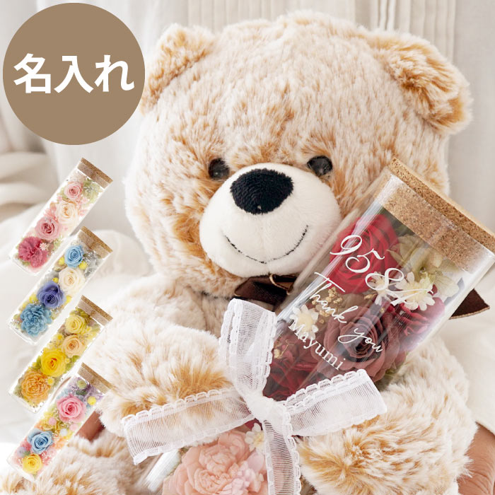 | 【 ボトルプリザーブドフラワーベア 】 プリザーブドフラワーの入ったボトルをぎゅっと抱きしめた、 ふんわり柔らかいくまのぬいぐるみ♪ あなたと一緒に「ありがとう」を届けてくれます ボトルプリザーブドフラワーには大切な記念日やメッセージ、お名前を入れて特別な贈り物に ■プリザーブドフラワー お手入れ不要で長期間鮮やかなまま飾ることができます ボトルにお花が入っているのでほこりよけにもなります | |