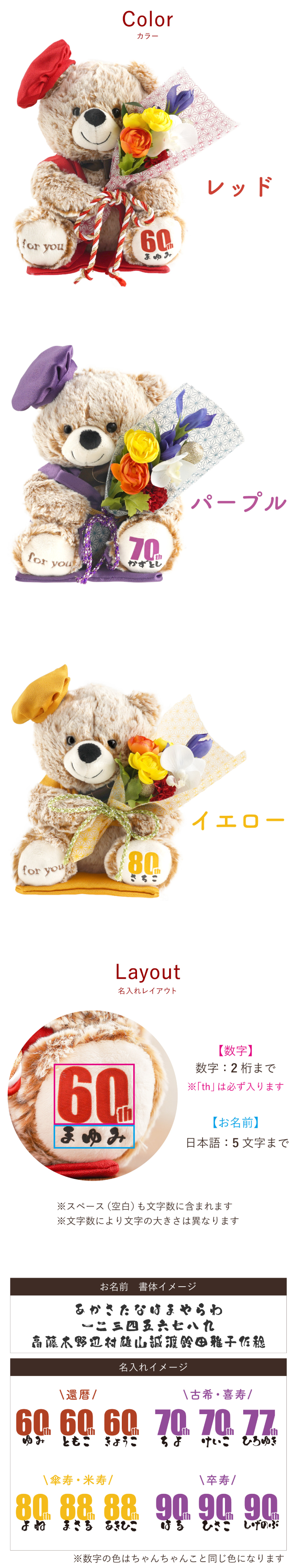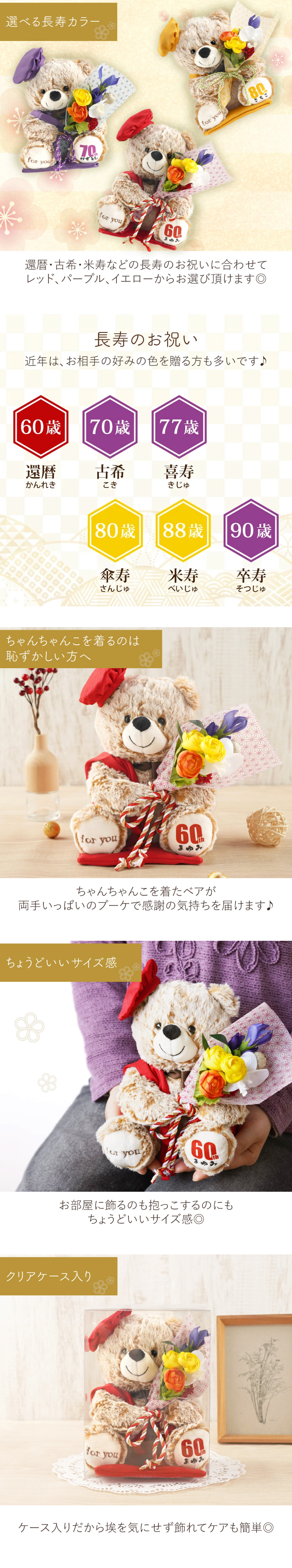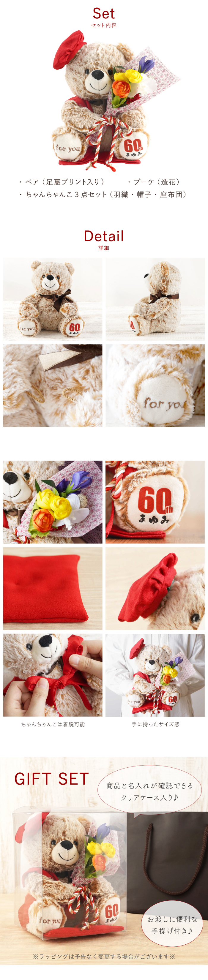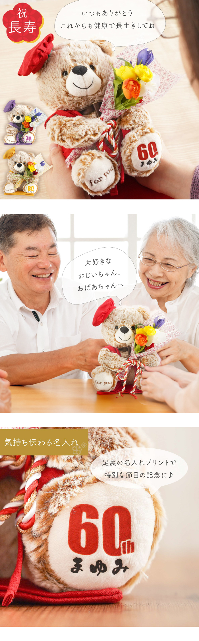 | 【ご長寿ちゃんちゃんこベア】 ちゃんちゃんこを着て、足うらにあの人の名前入りの かわいいオリジナルベアが長寿をお祝い♪ カラーは長寿祝いのにぴったりな3色! ちゃんちゃんこを着るのはちょっと恥ずかしい…そんな方へのプレゼントにぴったりです。 手に持ったお花と足裏の名入れプリントが気持ち伝わる世界で一つの贈り物に♪ クリアケース付きなので埃も気にせずそのまま飾れるのも嬉しいポイント! 名入れ 還暦 ちゃんちゃんこ ベアは、還暦祝い や 古希 喜寿 傘寿 米寿 卒寿 祝いの贈り物、 60代 男性 女性 お父さん お母さん おじいちゃん おばあちゃん 義父 義母 夫 妻 へのプレゼント 長寿 祝い 父の日 母の日 敬老の日 などのギフトにオススメです◎ 名入れ 還暦 ちゃんちゃんこ ベアは、還暦 祝いの贈り物、60代 男性 女性 お父さん お母さん おじいちゃん おばあちゃん 義父 義母 夫 妻 へのプレゼント 長寿 祝い 父の日 母の日 敬老の日 などのギフトにオススメです◎ | |