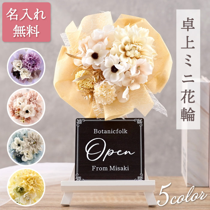 | 【ミニ花輪 くすみカラー】 「こんなサイズの花輪があるの?!」 「なにこれかわいい!」 見せた瞬間、周りに笑顔の花が咲く、会話に花が咲くような、 卓上サイズのミニ花輪 選べる5色のオシャレなくすみカラーは当店限定のオリジナル! 開店祝いや周年祝い、結婚祝いまでどんなシーンでも送りやすいのが特徴です 卓上サイズなので置き場所に困らないのも嬉しいポイントです♪ 中心のお花は鎌倉のお花屋さんが心を込めて1点1点手作りで作っています アーティフィシャルフラワーなので、枯れる心配がなく、お手入れも簡単 開店祝いや周年祝いのギフトにも、くすっと笑えるネタにも、 誕生日や結婚祝い、還暦祝いなど、どんなシーンにも贈ることができます お好きなメッセージや文字を入れて、世界に一つだけのギフトを贈ってみませんか♪ 名入れ ミニ花輪 くすみカラーは 企業 会社 美容室 美容院 サロン カフェ 居酒屋 バー 飲食店 の 周年祝い 開店 開業 開院 祝い の 贈り物 に ピッタリ です 名前を入れて世界に一つのプレゼント! | |
