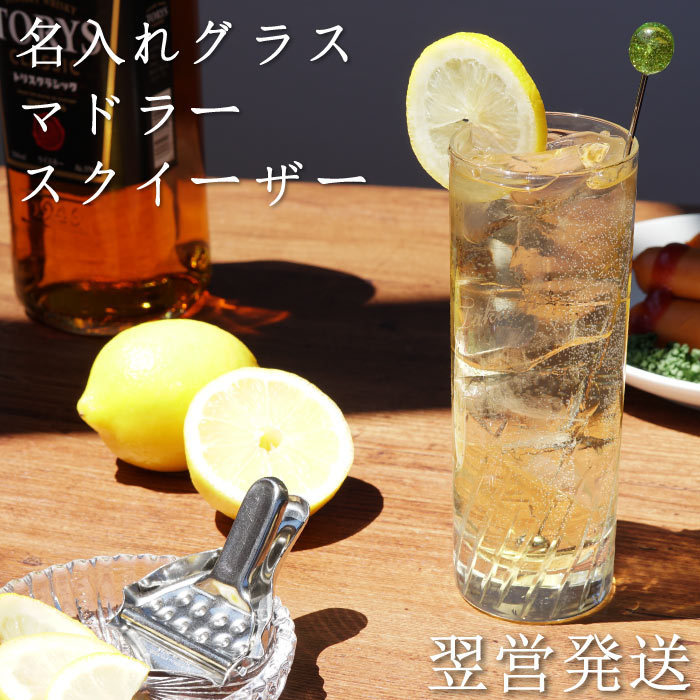 仕様 / サイズ | ■セット内容 グラス マドラー スクイーザー(レモン絞り器) [グラス] ■材質:ガラス ■容量:300ml ■サイズ:160x59mm ■重量:約252g ■生産国:日本 ※食洗機可 ※ハンドカット商品の為、ひとつひとつ職人がカットしております [マドラー] ■材質:ステンレス(ピューターメッキ)/ポリエステル樹脂 ■長さ:185mm ■原産国:日本 ※食洗機不可 [スクイーザー(レモン絞り器)] ■材質:ステンレス ■サイズ:70x75x20mm ■原産国:日本 ※食洗機可 |