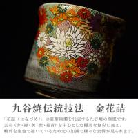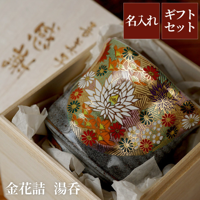 | 【九谷焼 金花詰め 湯呑み 単品】 九谷焼は360年の歴史を誇り、石川県を代表する伝統工芸品として国内外から人気のある色絵陶磁器です。 その特徴であり最大の魅力が「上絵付け」による豪放華麗な色絵装飾。 湯呑の上絵付けは、豪華絢爛を代表する九谷焼の画風「花詰」。 縁取りや模様が金色で描かれた通称「金花詰」は光の加減で様々な表情が見られます。 力強い九谷焼の器に繊細で可愛らしい上絵付けが魅力です。 ■気持ち伝える!桐箱に名入れ彫刻 桐箱にお名前などを彫刻できます。 箱を開ける前と開けた後で二度嬉しくなる、そんな贈り物に♪ ■名入れで、オリジナルの特別なプレゼントに。 お父さん、お母さんへ、父の日・母の日の贈り物に、 おじいちゃん、おばあちゃんへ敬老の日、 長寿祝い、還暦、古希、喜寿、米寿、傘寿、卒寿、のお祝いの品にもオススメです! 上司へのプレゼント、送別会、退職祝いの贈り物にも◎ 名入れで、世界にひとつのプレゼント! | |