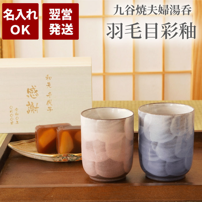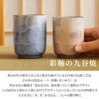 | 【桐箱入り 九谷焼 夫婦湯呑 羽毛目彩釉】 子供の時は言葉やお手伝いでしかできなかった感謝の気持ちを形に。 古くからことわざにもあるように 朝に飲むお茶は一日の災いから守ってくれる、その日の幸せを増やすとも考えられてきました。 お茶の時間をより優雅に、毎日使うものだからこそこだわりを。 大切な方へ心安らぐひと時と末永い幸せをお届けします♪ 九谷焼とは、約360年の歴史を誇る石川県の伝統が生み出した五彩の美。 その中の彩釉(さいゆう)とは、異なる色の釉薬を塗り分けたり、重ねながら器全体を覆っていく技法の一つです。 淡い色味にシンプルなデザインなので飽きも来ず、上品で愛らしい夫婦湯呑です。 共に年を重ねる2人の幸せがこれからも続きますように。 ■名入れ桐箱 桐箱にお名前や日付を彫刻できます。 見るたび心が温まる世界にひとつの贈り物♪ 名入れで世界一つのプレゼントに♪ | |