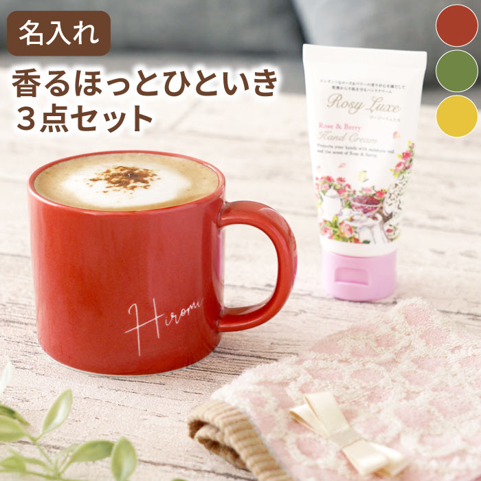 | 【 香るほっとひといきセット 】 日本製(波佐見焼)のシンプルな名入れマグカップ、マシュマロのような触り心地のハンカチ、しっとり潤い香りに癒されるハンドクリームのセット♪ 名入れとギフトラッピングで特別な贈り物に! いつもがんばっているあの人にほっと一息つけるギフトを♪ | |