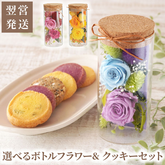 | 【筒入りクッキー2種+ミニボトルフラワー(台座付)】 野菜・フルーツ・雑穀のシンプル素材を活かしたやさしいクッキーと、お花屋さんこだわりのミニボトルフラワーがセットになった嬉しいギフト クッキーは常温で30日もつのですぐにお渡しができなくても安心♪ 筒入りで美味しさ長持ち、ゆっくりお楽しみいただけます セット梱包だからボリューム感たっぷり! 専用のボックスにお入れし、ギフトバッグをつけてお届けします | |
