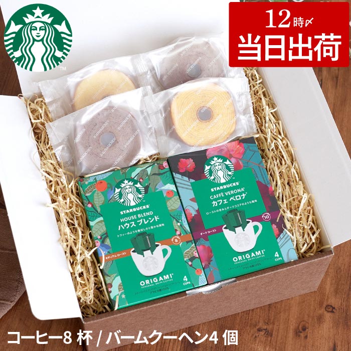| 【 スターバックスコーヒー2個+バームクーヘン4個ギフトセット 】 「スターバックス オリガミ(R)」2種類とバームクーヘン4個をセットにした、当店オリジナルのスタバギフトセットです。 セット梱包だからボリューム満点! 専用のギフトボックスにお入れし、ギフトバックもつけてお届けします。 バウムクーヘンは縁起の良いお菓子とされ、引き出物や内祝い、出産内祝いなどの様々なお祝い事や御礼の贈り物に最適です。 プチギフト、ご自宅用としても是非ご活用ください。 「スターバックス オリガミ(R)」は、アラビアカ種の豆を使った1杯分のドリップタイプのコーヒーです。 人気のハウスブレンドとしっかりとしたコクが特徴のカフェベロナの2種類を選びました。 贈り物に最適の程よい甘みのあるバームクーヘンはコーヒーにピッタリなスイーツです。 おいしいスイーツとともに、日本の文化“折り紙”を楽しむように、コーヒーをいれるプロセスや時間をお楽しみください。 <ネスレ スターバックス オリガミ パーソナルドリップコーヒー > 【ハウスブレンド】 いきいきとして調和のとれた味わい ナッツとカカオのニュアンスにローストのかすかな甘み、そこに酸味とコクが見事に調和した風味が特徴です。 すべてのバランスがよく、大変人気のブレンドで、どなたでも気に入っていただけるコーヒーです。 【カフェベロナ】 ダークココアのような口あたり、ロースト感のある深みや甘みと、しっかりとしたコクの奥行きのある豊かなブレンド。 イタリアン ローストによる深みが加わっています。 | |