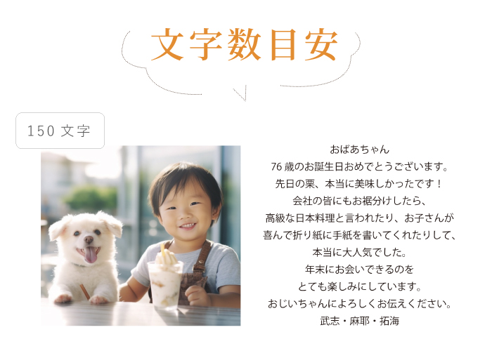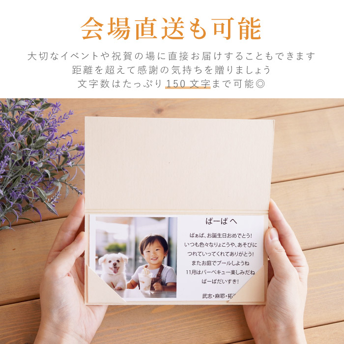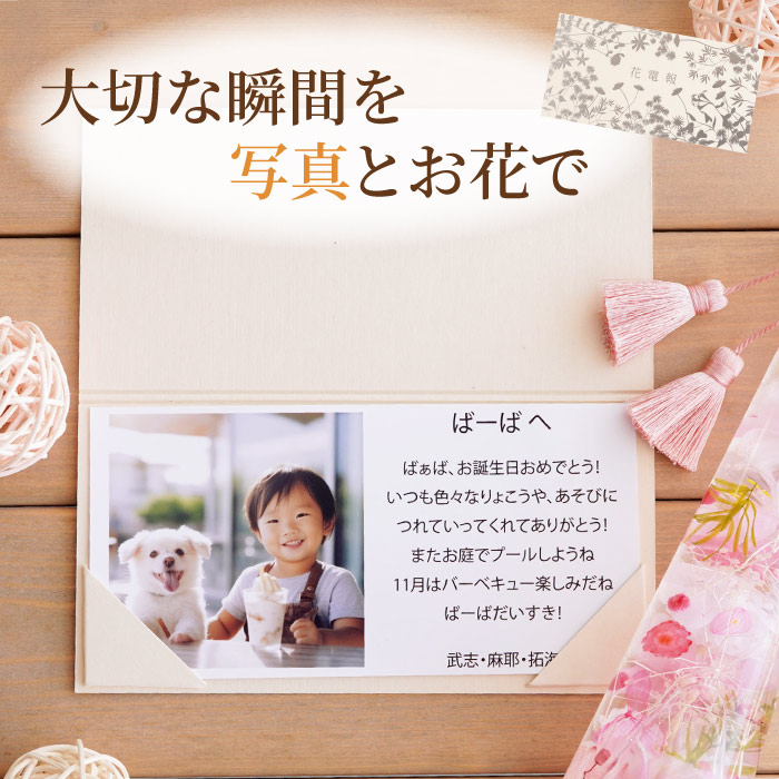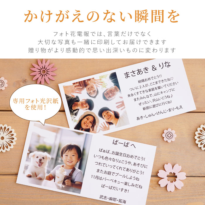 | 仕様 / サイズ | ■電報台紙:9cm×18cm ■通常のギフトのメッセージカードをバージョンアップしたいときにもご利用くださいませ ■ 文字数は150文字までとなります 【12時までの写真到着で最短翌日到着】 ■写真データの送り方写真のjpgデータをメールに添付してください 『info@hanamarika.com』※クリックするとメールアプリが開きます にお送りください。 (メール本文に購入者様のお名前を記載ください) ※お写真データをメールにてinfo@hanamarika.comにお送り下さい。 ※お写真の当店への到着は12時が〆切です。 ※お写真の確認が出来ましたら、当店より返信メールをお送り致します。 当店からの返信メールが確認出来ない場合には、必ずご連絡を頂きますようお願い申し上げます。 |