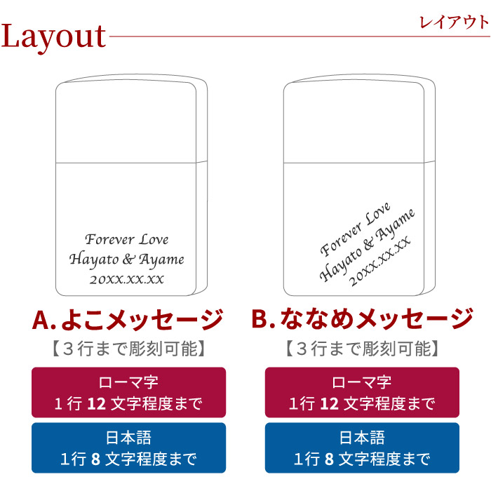 | 彫刻内容 | ■文字数 [よこ・ななめ・右よせメッセージ] ローマ字:1行12文字程度3行まで 日本語:1行8文字程度3行まで [イニシャル] ローマ字:3文字程度まで(ドットを含む) ※1行のみ彫刻可能 [たて書き・さし札] 日本語:4文字程度まで ※1行のみ彫刻可能 ※こちらは片面のみの彫刻です |